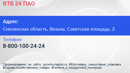 ВТБ 24, ПАО по адресу Смоленская область, Вязьма, Советская площадь, 2 в дальнейшем Организация, размещена в следующих категориях: