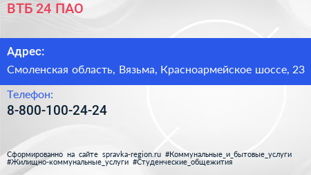 ВТБ 24, ПАО по адресу Смоленская область, Вязьма, Красноармейское шоссе, 23 в дальнейшем Организация, размещена в следующих категориях: