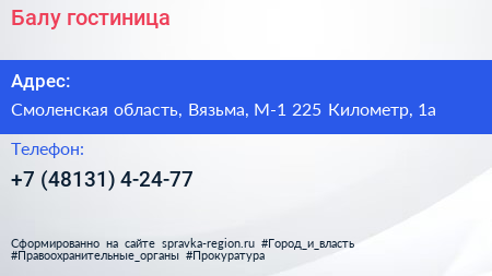 Балу, гостиница по адресу Смоленская область, Вязьма, М-1 225 Километр, 1а в дальнейшем Организация, размещена в следующих категориях:
