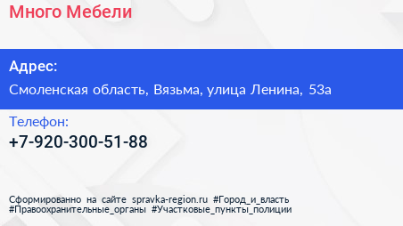 Много Мебели по адресу Смоленская область, Вязьма, улица Ленина, 53а в дальнейшем Организация, размещена в следующих категориях: