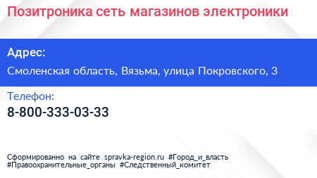Позитроника, сеть магазинов электроники по адресу Смоленская область, Вязьма, улица Покровского, 3 в дальнейшем Организация, размещена в следующих категориях: