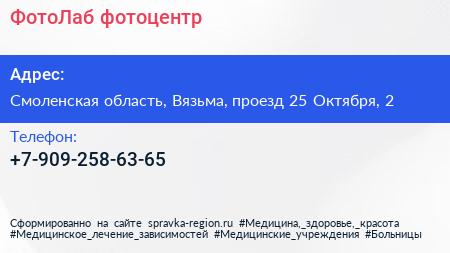 ФотоЛаб, фотоцентр по адресу Смоленская область, Вязьма, проезд 25 Октября, 2 в дальнейшем Организация, размещена в следующих категориях: