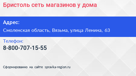 Бристоль, сеть магазинов у дома по адресу Смоленская область, Вязьма, улица Ленина, 63 в дальнейшем Организация, размещена в следующих категориях: