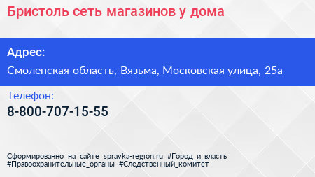 Бристоль, сеть магазинов у дома по адресу Смоленская область, Вязьма, Московская улица, 25а в дальнейшем Организация, размещена в следующих категориях: