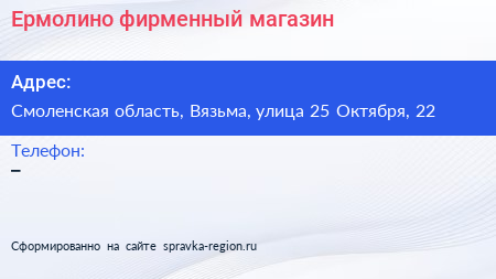 Ермолино, фирменный магазин по адресу Смоленская область, Вязьма, улица 25 Октября, 22 в дальнейшем Организация, размещена в следующих категориях:
