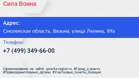 Сила Воина по адресу Смоленская область, Вязьма, улица Ленина, 89а в дальнейшем Организация, размещена в следующих категориях: