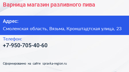 Варница, магазин разливного пива по адресу Смоленская область, Вязьма, Кронштадтская улица, 23 в дальнейшем Организация, размещена в следующих категориях: