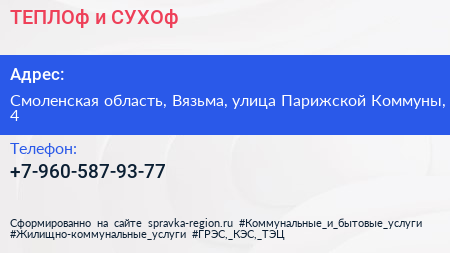 ТЕПЛОф и СУХОф по адресу Смоленская область, Вязьма, улица Парижской Коммуны, 4 в дальнейшем Организация, размещена в следующих категориях: