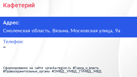 Кафетерий по адресу Смоленская область, Вязьма, Московская улица, 9а в дальнейшем Организация, размещена в следующих категориях: