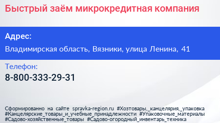 Быстрый заём, микрокредитная компания по адресу Владимирская область, Вязники, улица Ленина, 41 в дальнейшем Организация, размещена в следующих категориях: