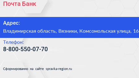 Почта Банк по адресу Владимирская область, Вязники, Комсомольская улица, 16 в дальнейшем Организация, размещена в следующих категориях: