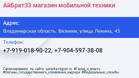 АйБрат33, магазин мобильной техники по адресу Владимирская область, Вязники, улица Ленина, 45 в дальнейшем Организация, размещена в следующих категориях: