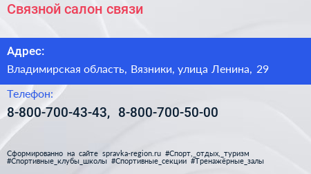 Связной, салон связи по адресу Владимирская область, Вязники, улица Ленина, 29 в дальнейшем Организация, размещена в следующих категориях: