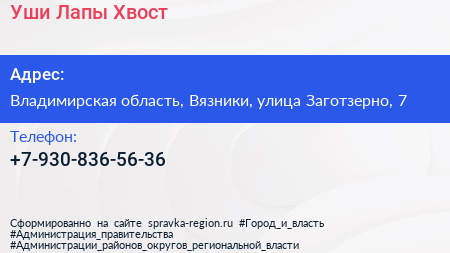 Уши. Лапы. Хвост по адресу Владимирская область, Вязники, улица Заготзерно, 7 в дальнейшем Организация, размещена в следующих категориях: