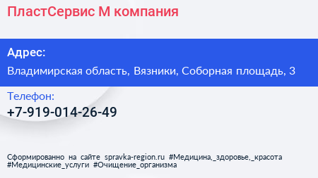 ПластСервис-М, компания по адресу Владимирская область, Вязники, Соборная площадь, 3 в дальнейшем Организация, размещена в следующих категориях: