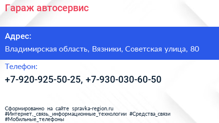 Гараж, автосервис по адресу Владимирская область, Вязники, Советская улица, 80 в дальнейшем Организация, размещена в следующих категориях: