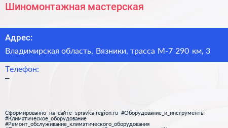 Шиномонтажная мастерская по адресу Владимирская область, Вязники, трасса М-7 290 км, 3 в дальнейшем Организация, размещена в следующих категориях: