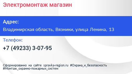 Электромонтаж, магазин по адресу Владимирская область, Вязники, улица Ленина, 13 в дальнейшем Организация, размещена в следующих категориях: