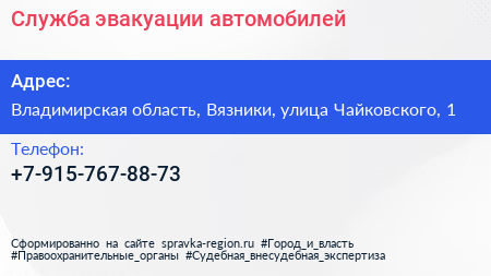 Служба эвакуации автомобилей по адресу Владимирская область, Вязники, улица Чайковского, 1 в дальнейшем Организация, размещена в следующих категориях: