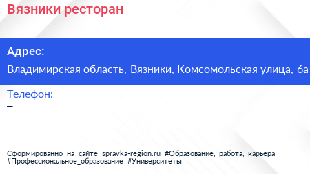 Вязники, ресторан по адресу Владимирская область, Вязники, Комсомольская улица, 6а в дальнейшем Организация, размещена в следующих категориях: