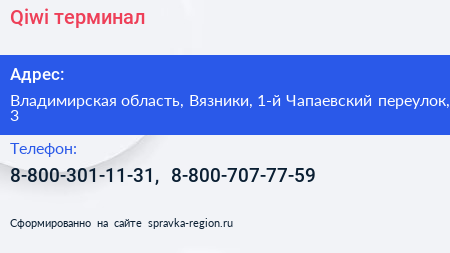 Qiwi, терминал по адресу Владимирская область, Вязники, 1-й Чапаевский переулок, 3 в дальнейшем Организация, размещена в следующих категориях: