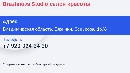 Brazhnova-Studio, салон красоты по адресу Владимирская область, Вязники, Сенькова, 16/6 в дальнейшем Организация, размещена в следующих категориях: