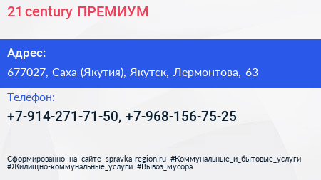 21 century ПРЕМИУМ по адресу 677027, Саха (Якутия), Якутск, Лермонтова, 63 в дальнейшем Организация, размещена в следующих категориях: