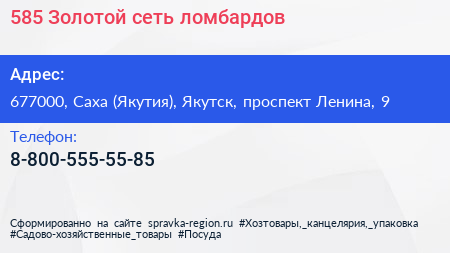 585*Золотой, сеть ломбардов по адресу 677000, Саха (Якутия), Якутск, проспект Ленина, 9 в дальнейшем Организация, размещена в следующих категориях: