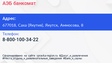 АЭБ, банкомат по адресу 677018, Саха (Якутия), Якутск, Аммосова, 8 в дальнейшем Организация, размещена в следующих категориях: