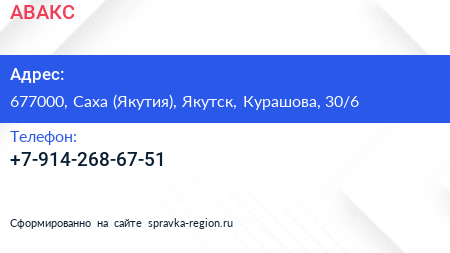 АВАКС по адресу 677000, Саха (Якутия), Якутск, Курашова, 30/6 в дальнейшем Организация, размещена в следующих категориях: