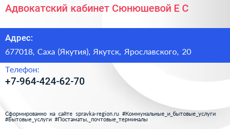 Адвокатский кабинет Сюнюшевой Е.С. по адресу 677018, Саха (Якутия), Якутск, Ярославского, 20 в дальнейшем Организация, размещена в следующих категориях: