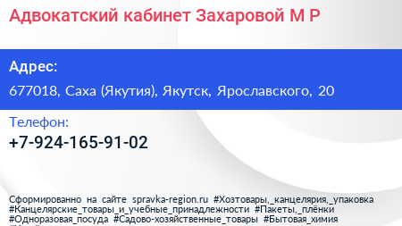 Адвокатский кабинет Захаровой М.Р. по адресу 677018, Саха (Якутия), Якутск, Ярославского, 20 в дальнейшем Организация, размещена в следующих категориях: