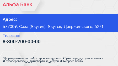 Альфа-Банк по адресу 677009, Саха (Якутия), Якутск, Дзержинского, 52/1 в дальнейшем Организация, размещена в следующих категориях: