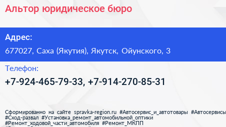 Альтор, юридическое бюро по адресу 677027, Саха (Якутия), Якутск, Ойунского, 3 в дальнейшем Организация, размещена в следующих категориях: