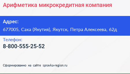 Арифметика, микрокредитная компания по адресу 677005, Саха (Якутия), Якутск, Петра Алексеева, 62д в дальнейшем Организация, размещена в следующих категориях: