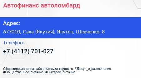 Автофинанс, автоломбард по адресу 677010, Саха (Якутия), Якутск, Шевченко, 8 в дальнейшем Организация, размещена в следующих категориях:
