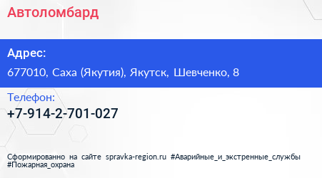 Автоломбард по адресу 677010, Саха (Якутия), Якутск, Шевченко, 8 в дальнейшем Организация, размещена в следующих категориях: