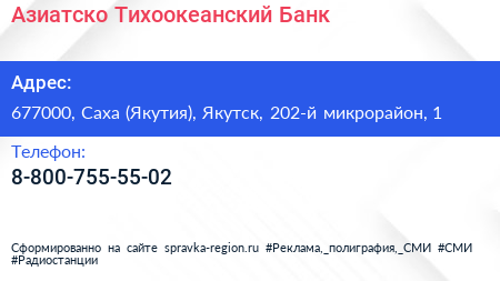 Азиатско-Тихоокеанский Банк по адресу 677000, Саха (Якутия), Якутск, 202-й микрорайон, 1 в дальнейшем Организация, размещена в следующих категориях: