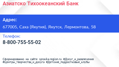 Азиатско-Тихоокеанский Банк по адресу 677005, Саха (Якутия), Якутск, Лермонтова, 58 в дальнейшем Организация, размещена в следующих категориях: