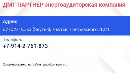 ДМГ ПАРТНЕР, энергоаудиторская компания по адресу 677027, Саха (Якутия), Якутск, Петровского, 12/1 в дальнейшем Организация, размещена в следующих категориях: