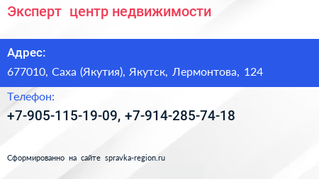 Эксперт+, центр недвижимости по адресу 677010, Саха (Якутия), Якутск, Лермонтова, 124 в дальнейшем Организация, размещена в следующих категориях: