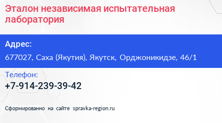 Эталон, независимая испытательная лаборатория по адресу 677027, Саха (Якутия), Якутск, Орджоникидзе, 46/1 в дальнейшем Организация, размещена в следующих категориях: