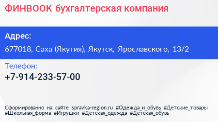 ФИНBOOK, бухгалтерская компания по адресу 677018, Саха (Якутия), Якутск, Ярославского, 13/2 в дальнейшем Организация, размещена в следующих категориях: