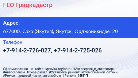 ГЕО-Градкадастр по адресу 677000, Саха (Якутия), Якутск, Орджоникидзе, 20 в дальнейшем Организация, размещена в следующих категориях: