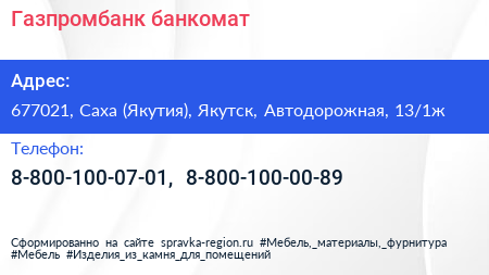 Газпромбанк, банкомат по адресу 677021, Саха (Якутия), Якутск, Автодорожная, 13/1ж в дальнейшем Организация, размещена в следующих категориях: