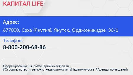 КАПИТАЛ LIFE по адресу 677000, Саха (Якутия), Якутск, Орджоникидзе, 36/1 в дальнейшем Организация, размещена в следующих категориях:
