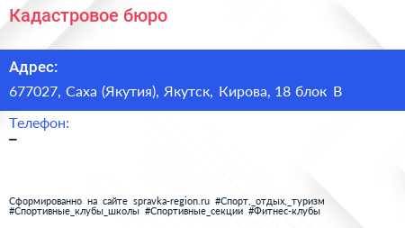 Кадастровое бюро по адресу 677027, Саха (Якутия), Якутск, Кирова, 18 блок В в дальнейшем Организация, размещена в следующих категориях:
