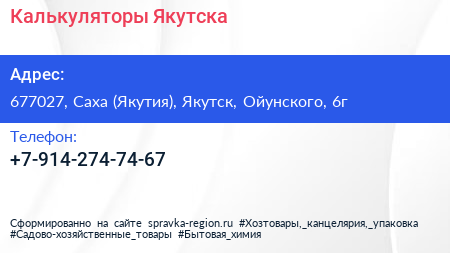 Калькуляторы Якутска по адресу 677027, Саха (Якутия), Якутск, Ойунского, 6г в дальнейшем Организация, размещена в следующих категориях: