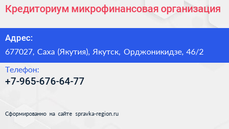 Кредиториум, микрофинансовая организация по адресу 677027, Саха (Якутия), Якутск, Орджоникидзе, 46/2 в дальнейшем Организация, размещена в следующих категориях: