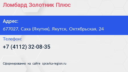 Ломбард Золотник Плюс по адресу 677027, Саха (Якутия), Якутск, Октябрьская, 24 в дальнейшем Организация, размещена в следующих категориях:
